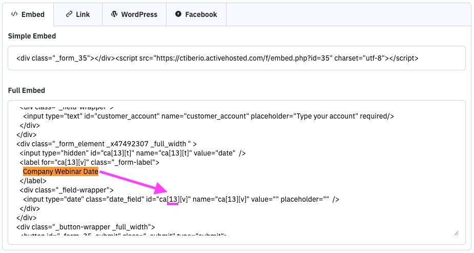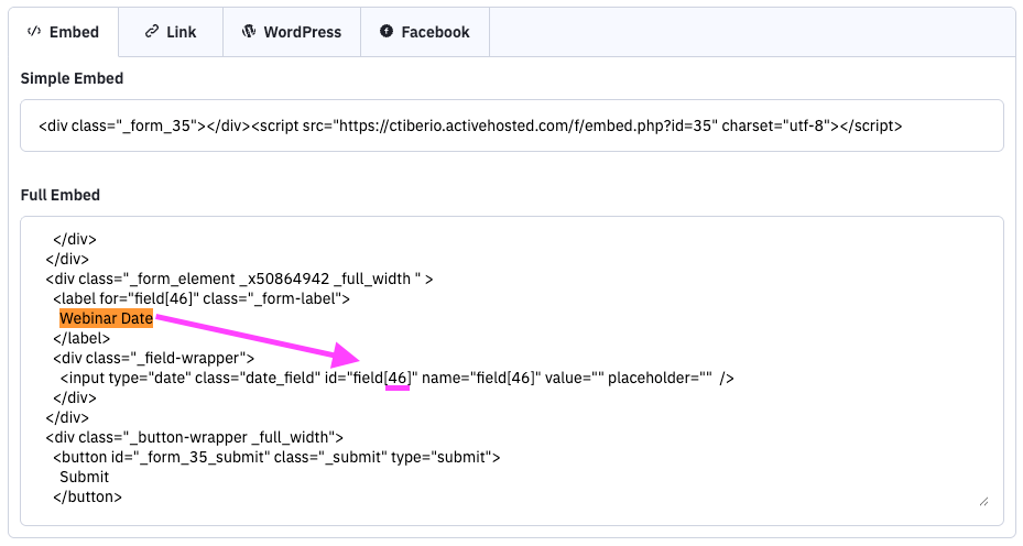 In the example below, we see that the field ID for the custom contact field, “Webinar Date,” is ‘46.’