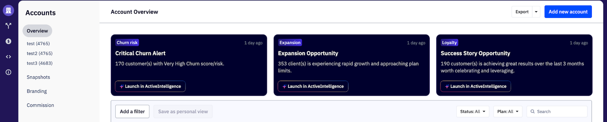 Active Intelligence will populate up to three cards at a time on your overview page. The cards will feature recommended actions based on the behaviors and needs of your client accounts. The Insight Cards are divided into different types, and each type is triggered by a specific action: