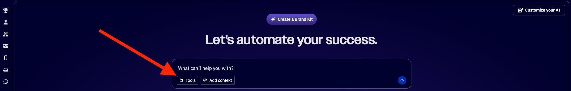 - In your ActiveCampaign account, click the “Tools” menu located inside the Active Intelligence prompt bar.