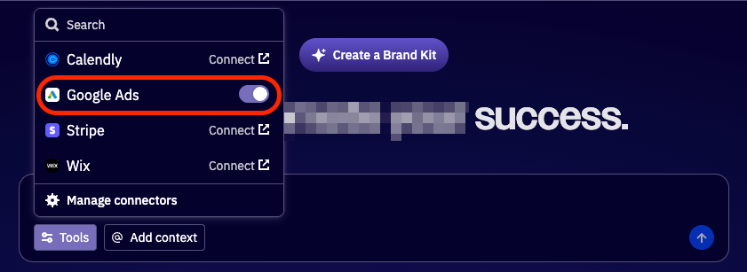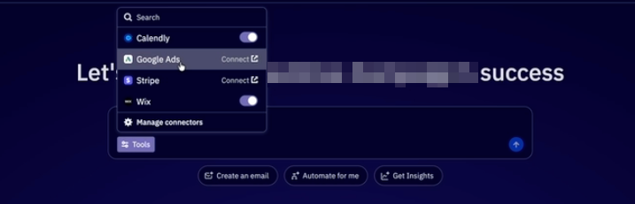 - You will be brought back to your ActiveCampaign account. Click the “Tools” menu in the Active Intelligence prompt bar and verify that the Google Ads connector is toggled on.