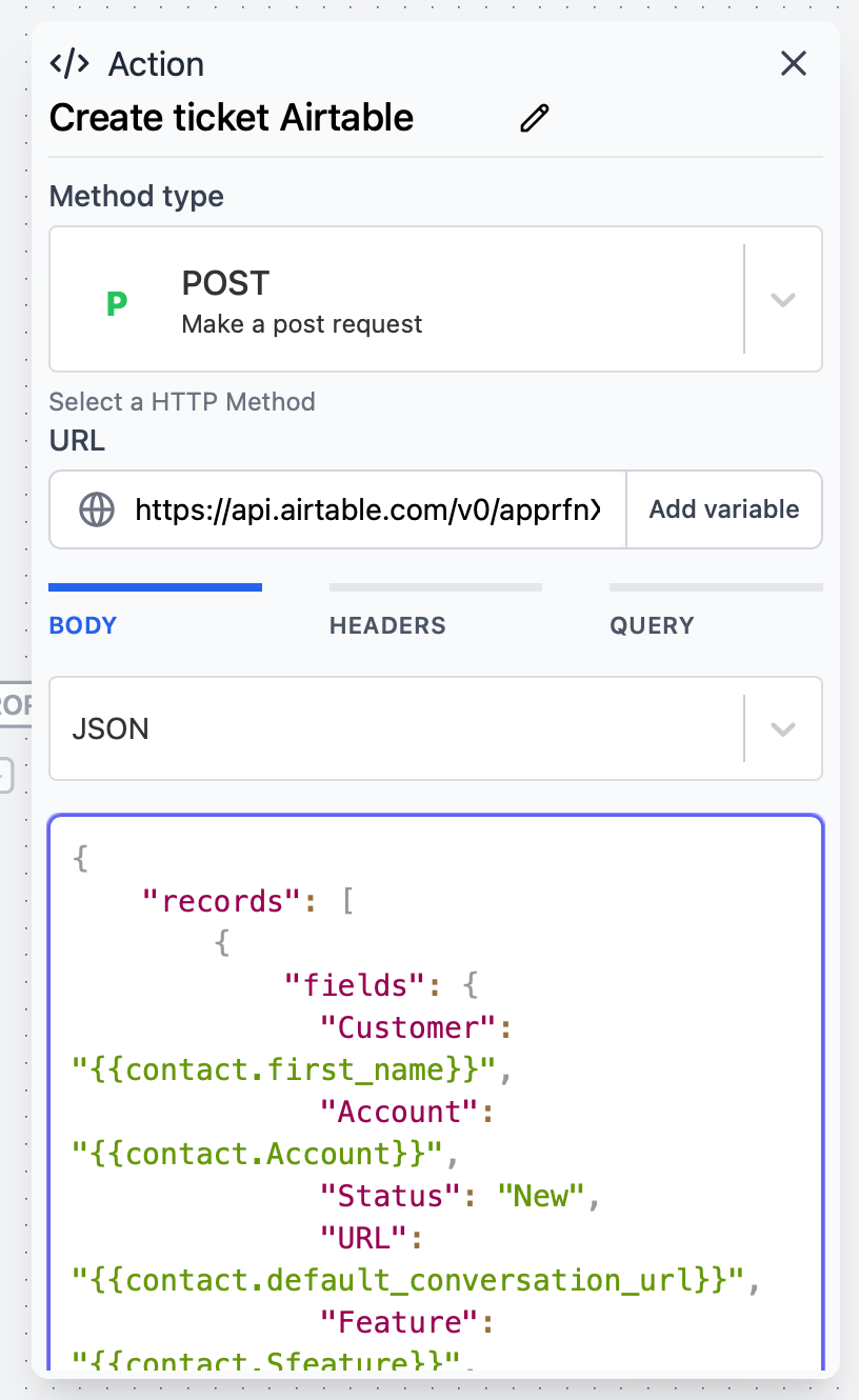 El paso "Acción" es ideal para actuar sobre una API externa basándose en las respuestas de los pasos anteriores. En esencia, el paso Acción es una solicitud HTTP que puede configurarse para enviar o solicitar datos a una API externa.