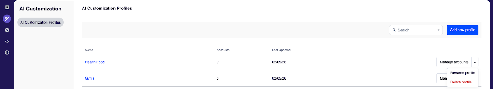 - Gestisci account - Seleziona gli account dei clienti che vuoi aggiungere o rimuovere da uno specifico profilo di personalizzazione IA