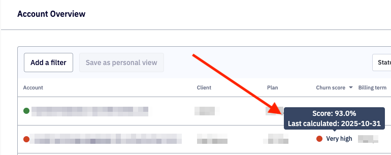 Os indicadores de Churn Score podem ser encontrados na "Página de visão geral da conta" do Portal do parceiro. Na coluna "Churn score", você encontra uma classificação de churn score e um indicador colorido correspondente: